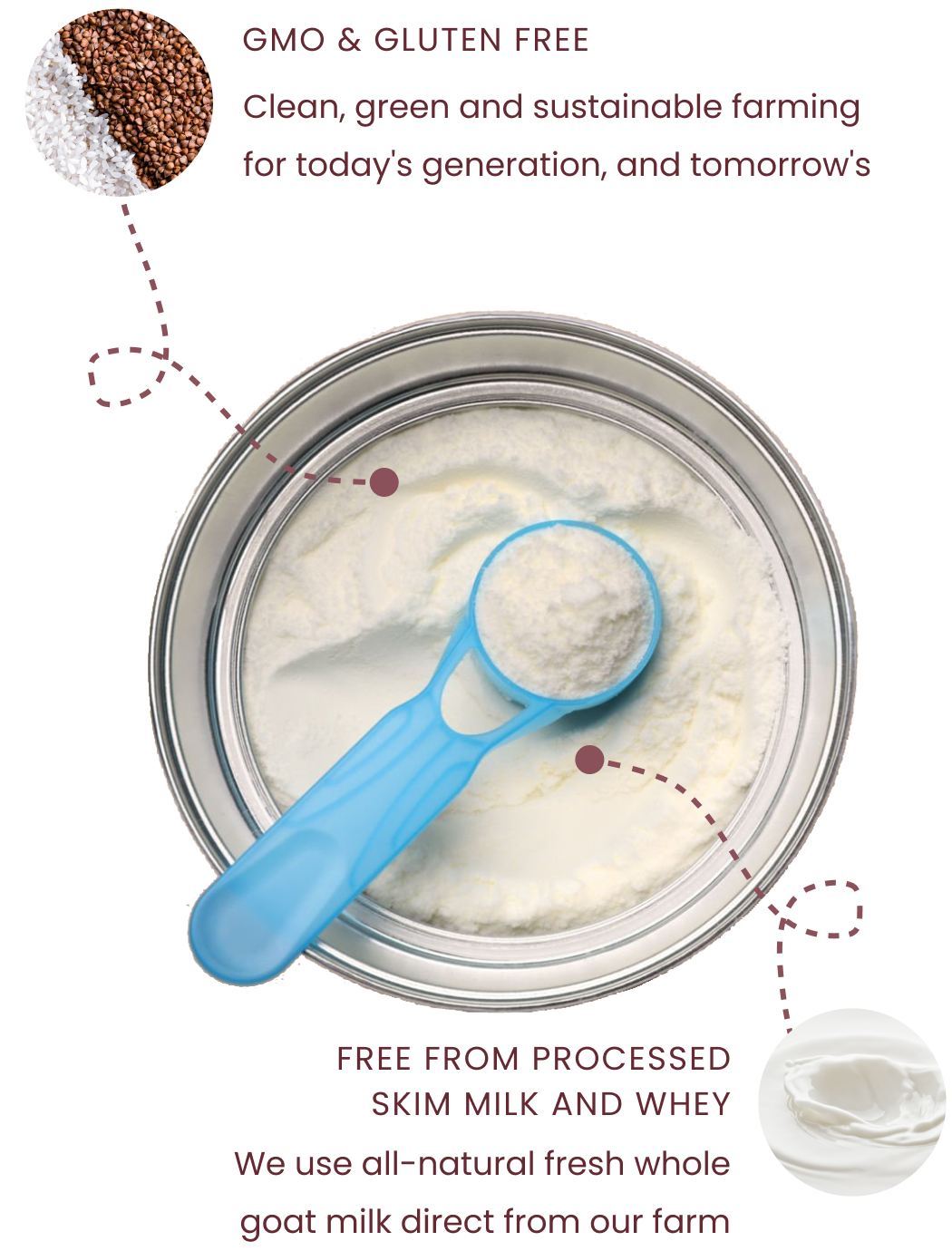 Full Cream Goat Milk Solids, Lactose (Milk), LittleOak Proprietary Oil Blend (Sunflower Oil, High Oleic Sunflower Oil, Pressed Coconut Oil, Pressed Flaxseed Oil), Galacto-oligosaccharide (GOS) (Milk), Minerals (Tricalcium Phosphate, Calcium Citrate, Trisodium Citrate, Magnesium Sulphate, Ferrous Lactate, Zinc Sulphate, Copper Gluconate, Sodium Selenite, Manganese Sulphate, Potassium Iodide), DHA Powder (Docosahexaenoic Oil from Schizochytrium sp.), Amino Acids (L-Tyrosine, L-Cysteine, L-Leucine, L-Tryptophan, L-Isoleucine), ARA Powder (Arachidonic Acid Oil from Mortierella alpine, Sodium Caseinate (Milk)), Choline, Vitamins (Vitamin C, Vitamin E, Vitamin B3, Vitamin A, Vitamin D3, Vitamin B5, Vitamin K1, Vitamin B1, Vitamin B6, Vitamin B2, Vitamin B12, Folic Acid, Biotin), Inositol, Antioxidant (α-Tocopherol), L-Carnitine.